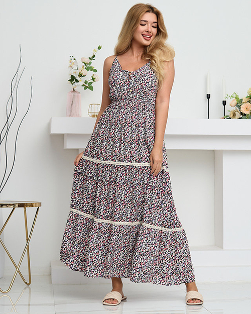 - Vzdušné dámske maxi šaty s jemným kvetinovým vzorom - ušité z tenkej bavlnenej látky. Model s tenkými ramienkami a výstrihom do V. V páse má sťahovaciu gumu. POZNÁMKA: Presnosť merania (+/-) 1 cm.