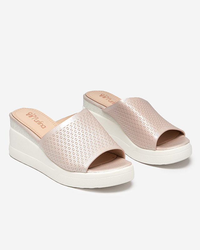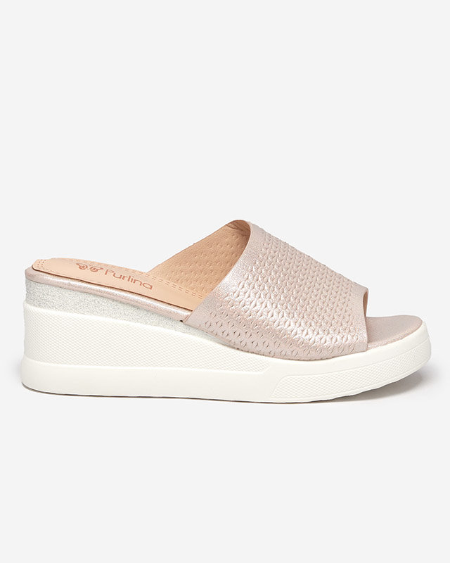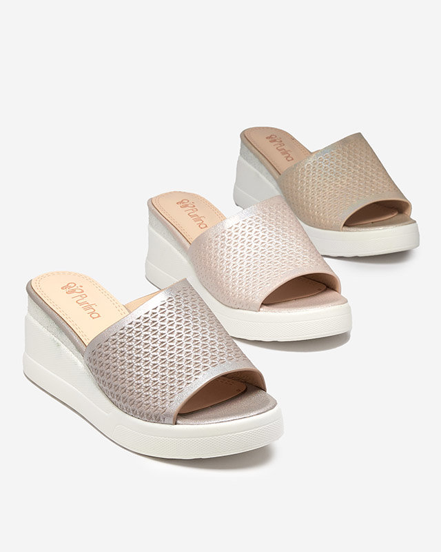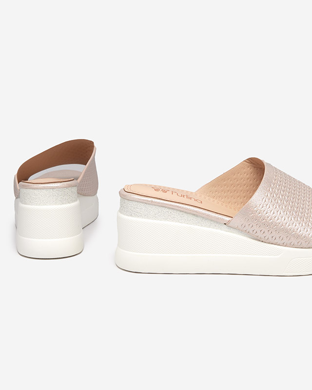 - Krásne dámske brokátové papuče na nízkom klinovom podpätku, vyrobené z ekologickej kože. Zvršok je zdobený ažúrom a má holografickú úpravu. Perfektná a pohodlná obuv na každý deň!
