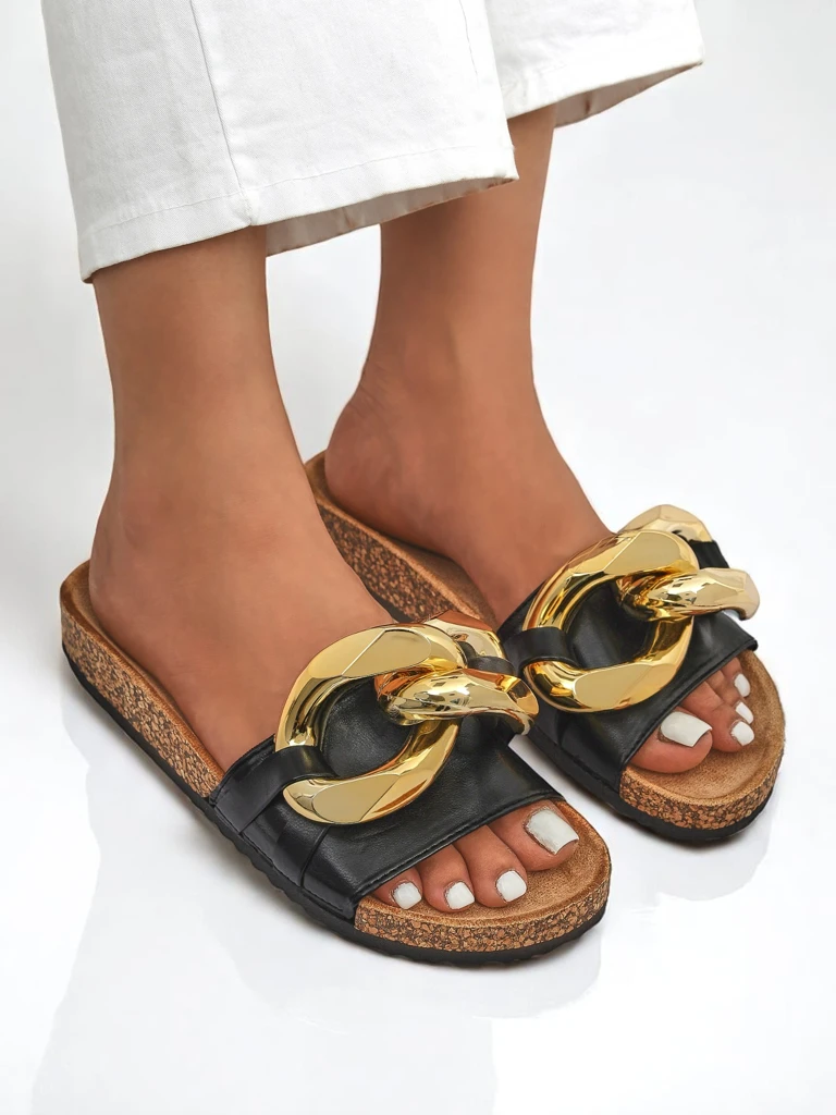Najbolj izstopajoč element Aurelia Catena je velika, okrasna zaponka v obliki zlate verige, ki daje natikačem izraznost in poudarja moderen značaj izdelka. Ta detajl, ki ga navdihujejo najnovejši trendi sredozemske mode in svetovnih modnih pist, pritegne pozornost, zaradi česar so natikači idealna izbira za ženske, ki cenijo stil in drzne dodatke.