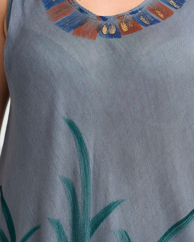 • Ľahká dámska pelerína šatového typu vyrobená z mäkkej a vzdušnej viskózovej látky. Model má okrúhly výstrih a rozšírený spodok. POZNÁMKA: Presnosť merania (+/-) 1 cm.