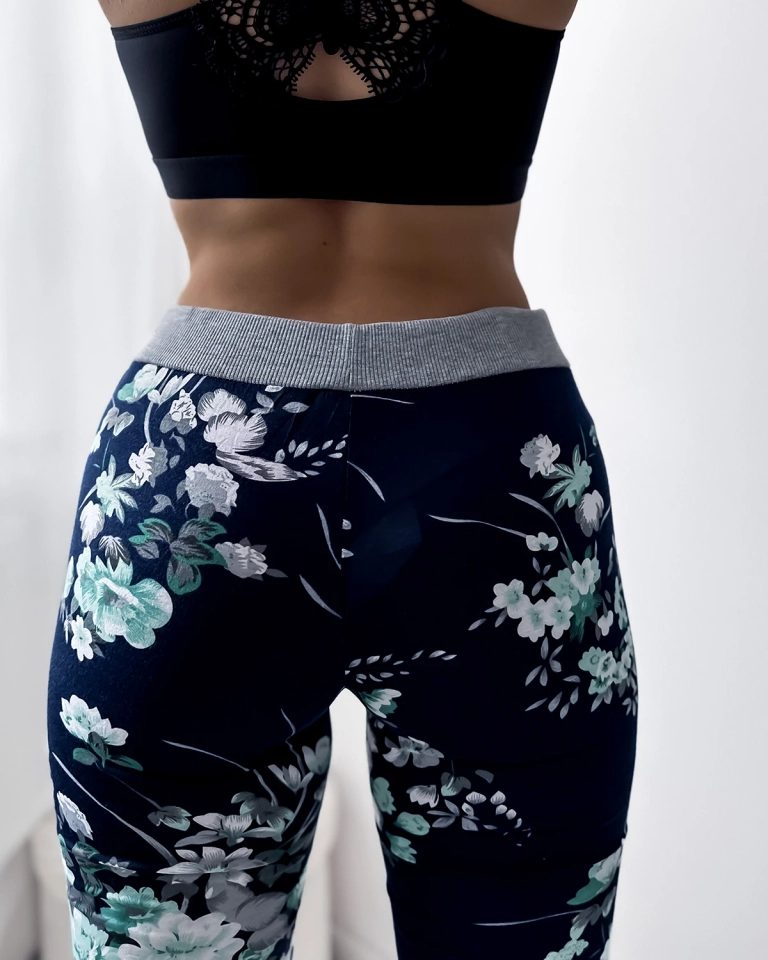 Dámske 3/4 tmavomodré kraťasy so zelenými kvetmi PLUS SIZE - Oblečenie