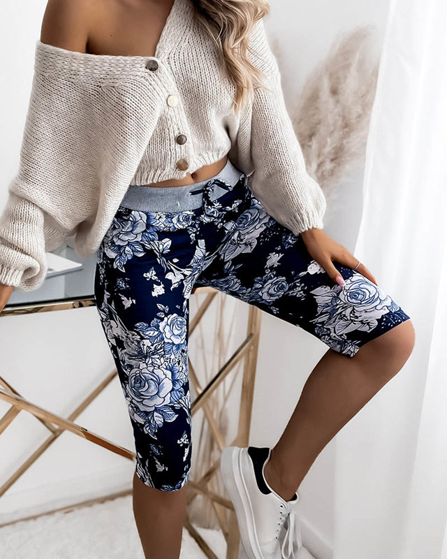 Kvetinové 3/4 dámske šortky v námorníckej modrej a modrej farbe. Nadmerné veľkosti oblečenia