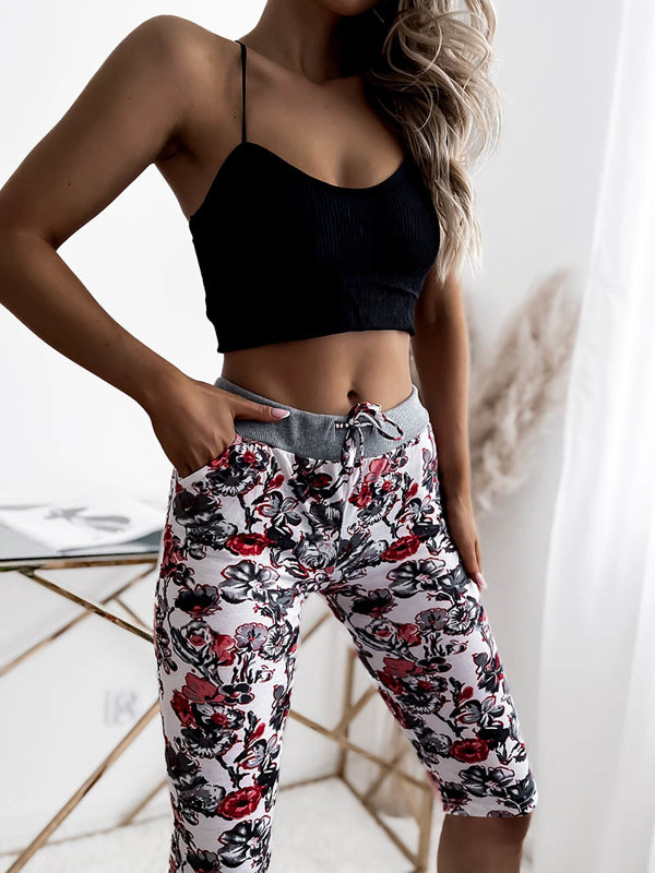 - Pohodlné dámske 3/4 šortky s vreckami, vyrobené z bavlnenej látky s kvetmi. Model má v páse gumu a viazané valčeky. POZNÁMKA: Presnosť merania (+/-) 1 cm.