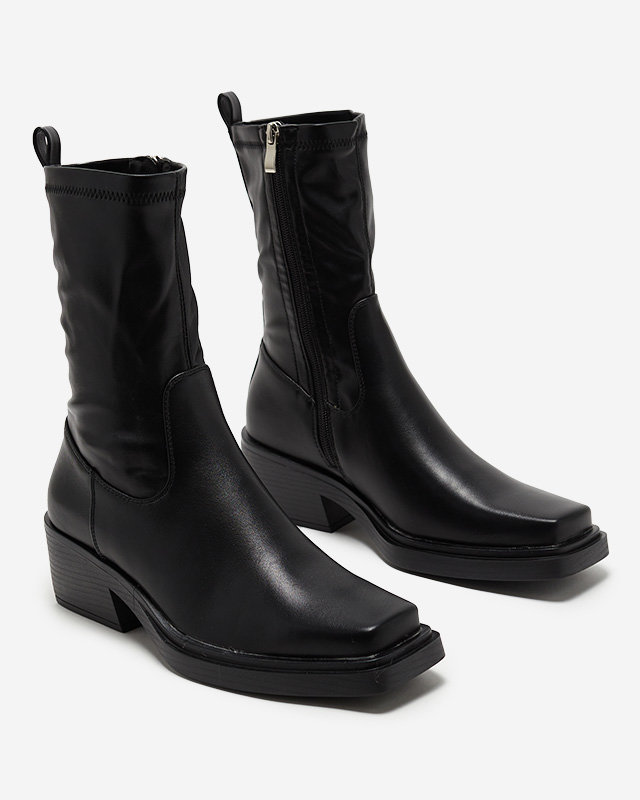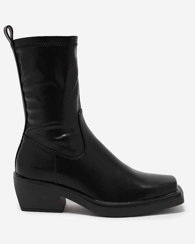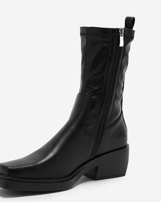 - Vysoké dámske čižmy z ekologickej kože. Model má nízky stĺpik, bočné zapínanie na zips a hranatú špičku. Topánky sú jemne zateplené. DÁMSKE VYSOKÉ ČIERNE TOPÁNKY SAFOGOVÉ TOPÁNKY