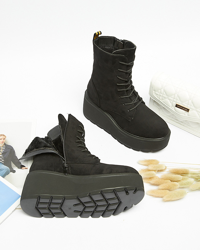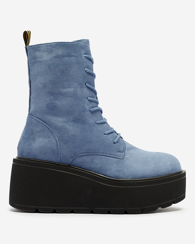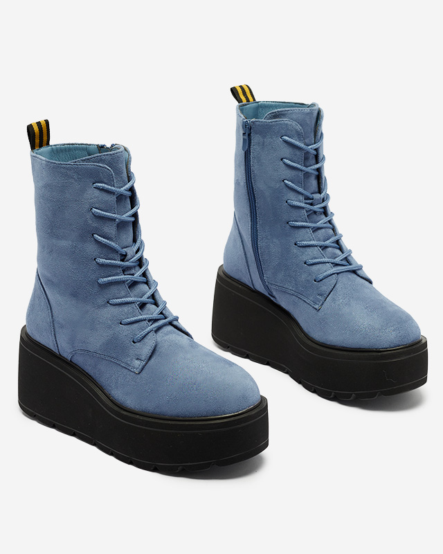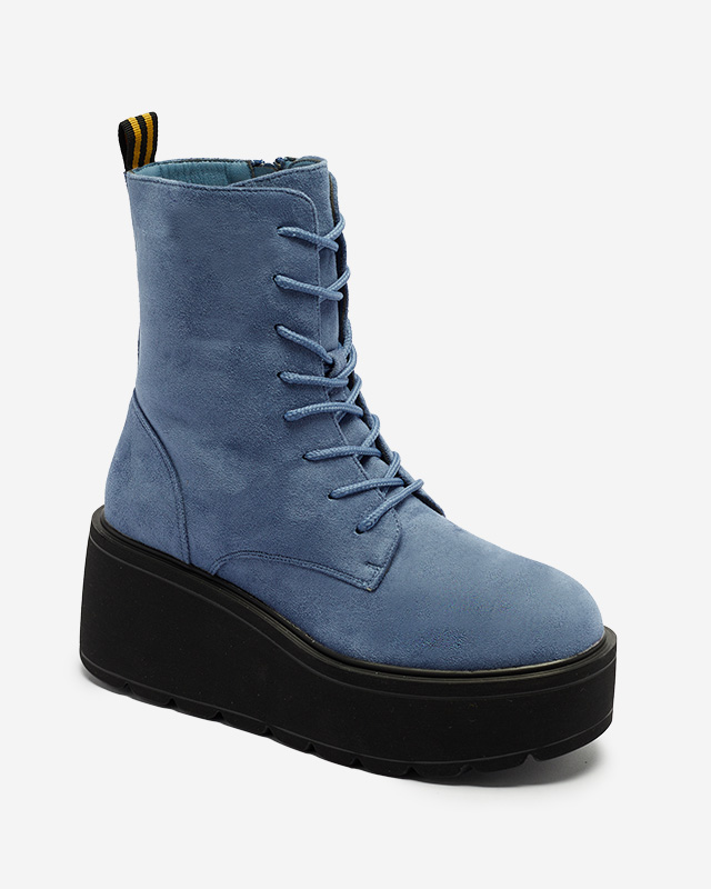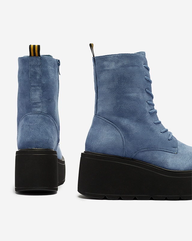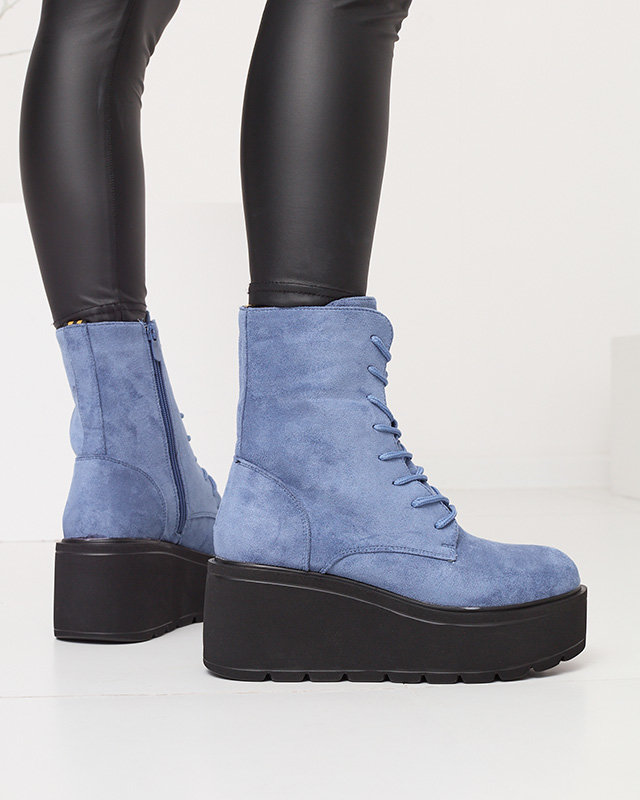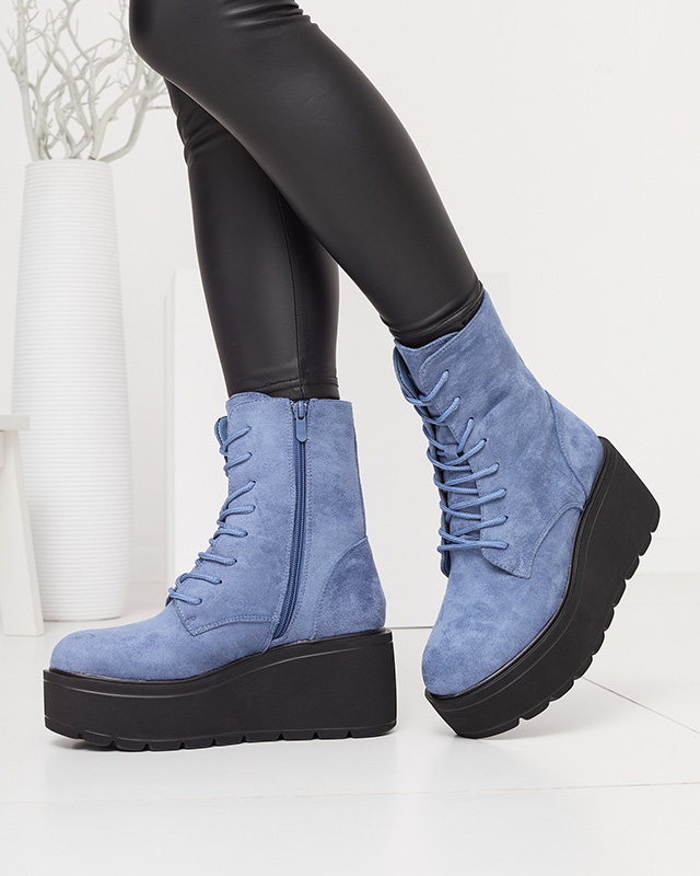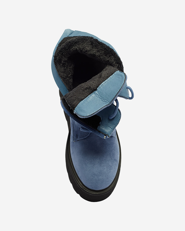 - Modré dámske čižmy na podpätku v kombinácii s platformou. Vyrobené z mäkkého eko-semišu, zateplené kožušinou vo vnútri. Model so šnurovaním a zapínaním na zips. modré zimné topánky EKO-ICE JEANNE