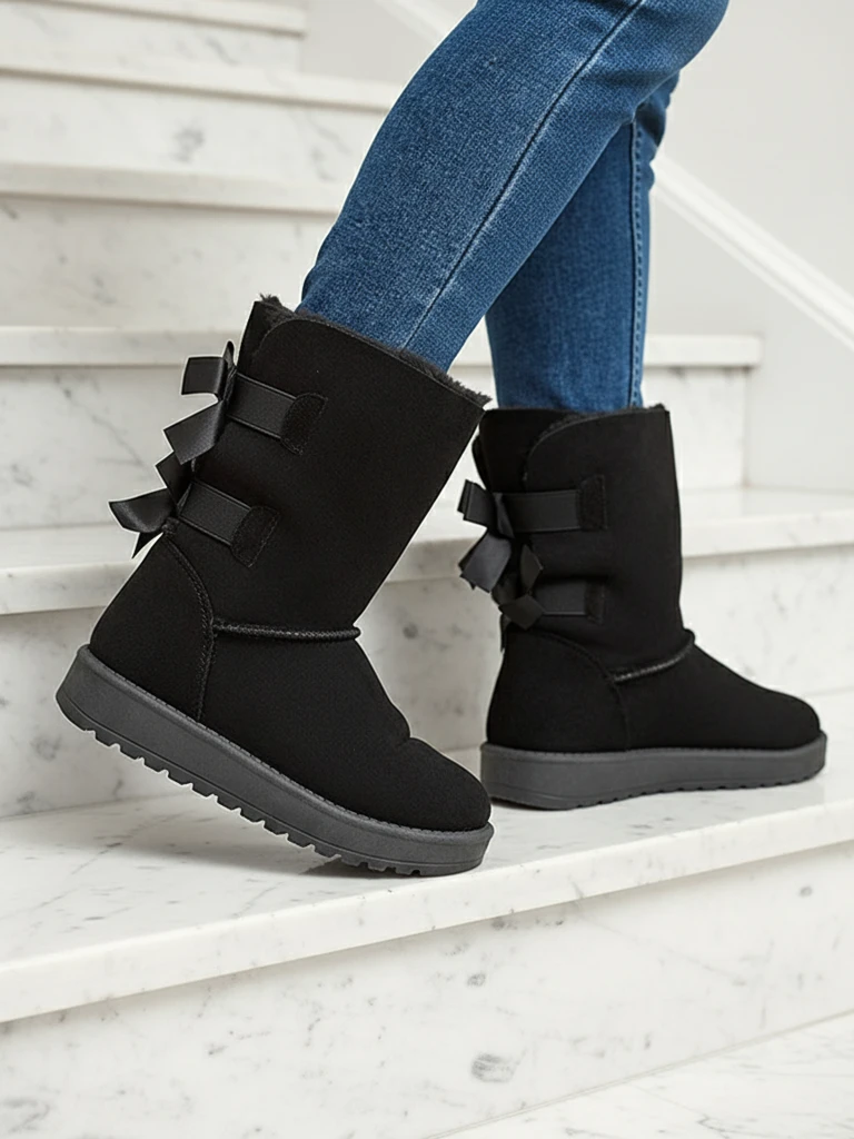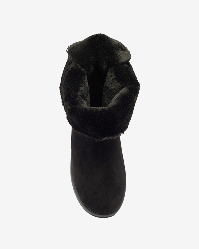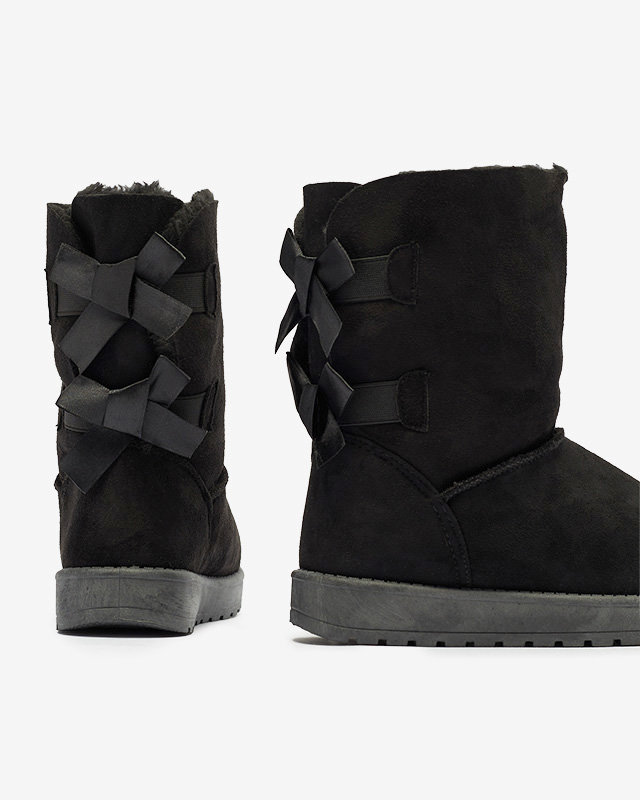 - Brezčasni ženski natikači za sneg, izdelani iz ekološkega semiš usnja. Model je na zadnji strani okrašen s pentljami, notranjost pa je obložena z mehko podlogo. Popolnoma bodo poudarili vsako vašo stilsko kombinacijo! ČRNI ZIMSKI ČEVLJI, OBLOŽENI S SNEGOM