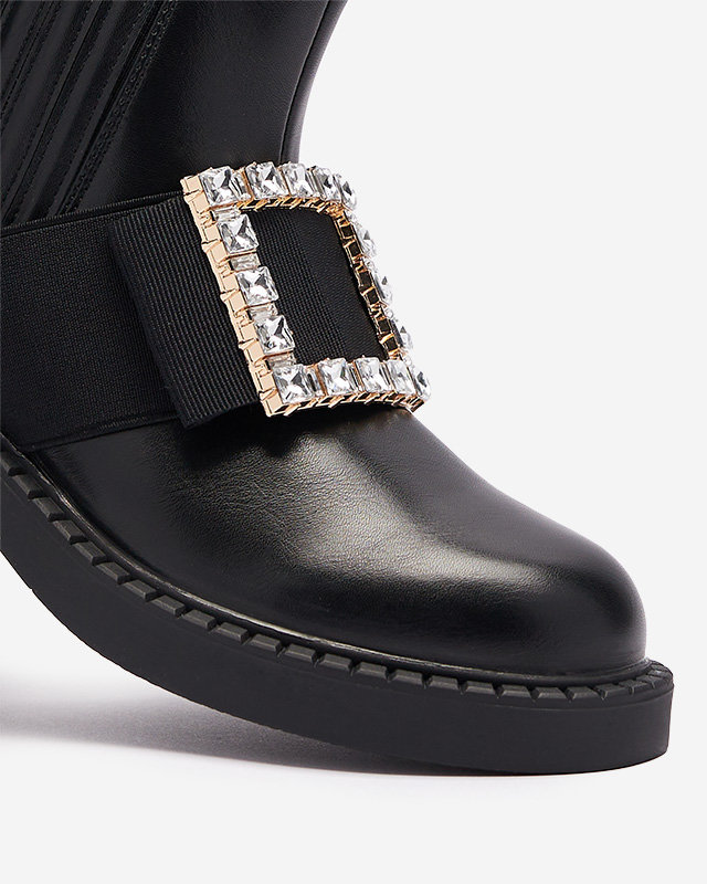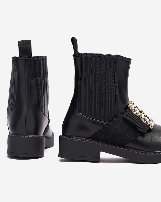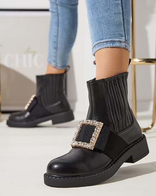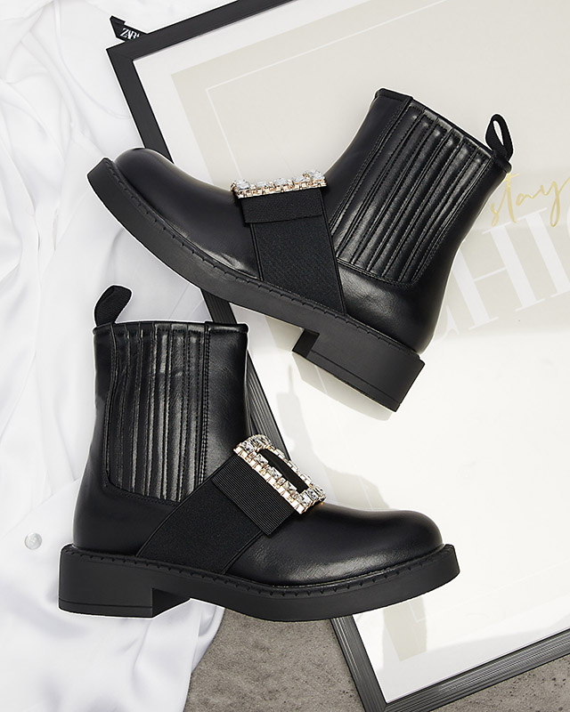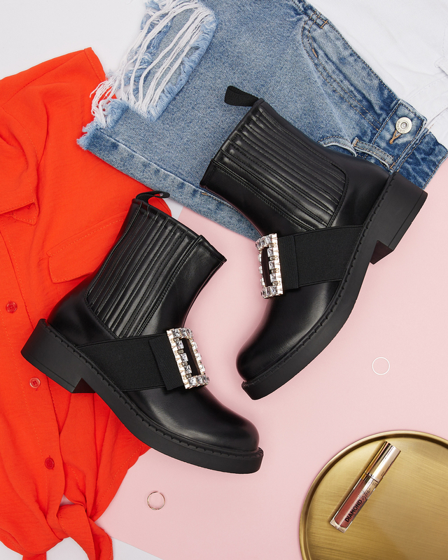 • Super módne dámske členkové čižmy na plochých podpätkoch. Zvršok je vyrobený z ekologickej kože, pričom vnútro je čiastočne zateplené jemnou kožušinkou. Pár má na podšívke kovovú ozdobu s kamienkami. ČIERNE POLOVANÉ TOPÁNKY ZENATA BOOTS