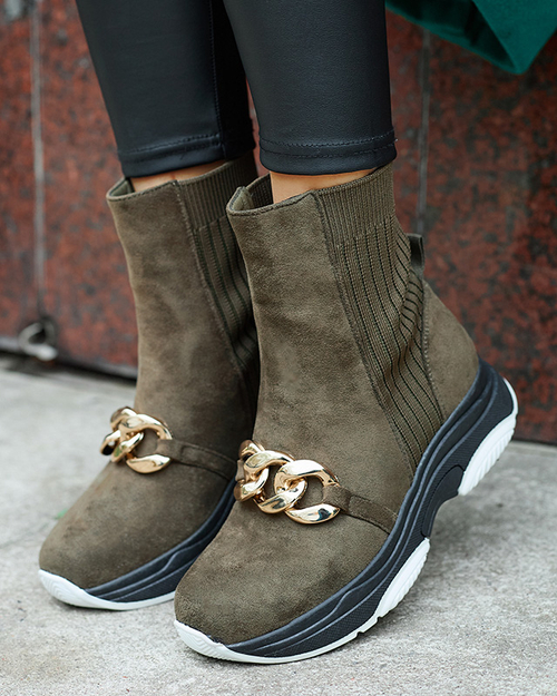 • Dámske čižmy na gumovej podrážke, vyrobené z mäkkého eko-semišu. V strede sú zateplené mäkkou kožušinou. Pár má na bokoch elastické vsadky. Zvršok je zdobený zlatou retiazkou. ZELENÉ ZATEPLENÉ DÁMSKE ČIŽMY CUZITTA