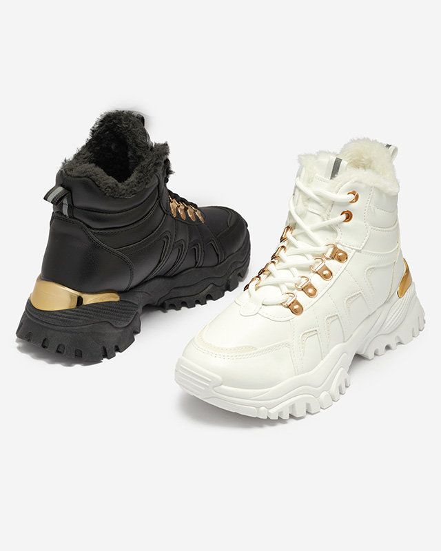 - Dámske snehové čižmy na pevnej podrážke so zvrškom z ekokože, pričom vnútro je vystlané kožušinou. Model má šnurovanie a zlaté prvky. Perfektné na zimu! Poznámka: výrobok má škvrny na materiáli.