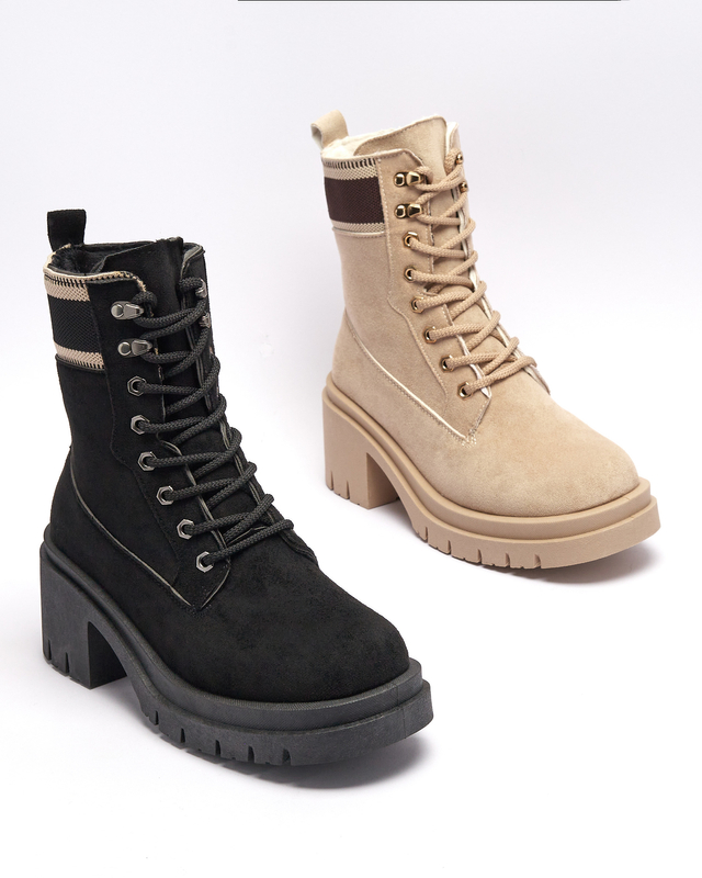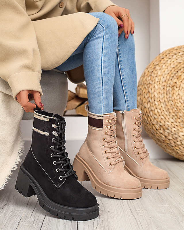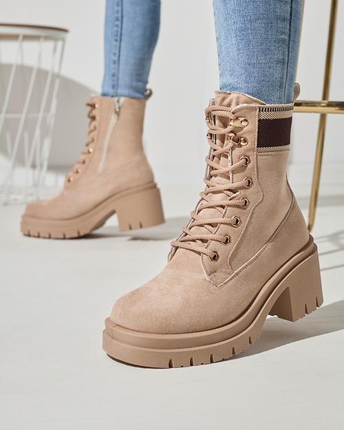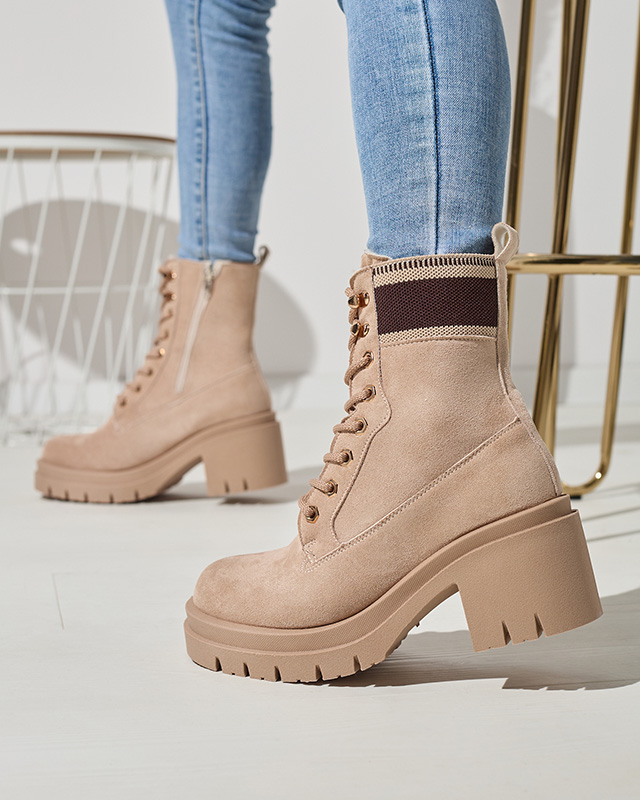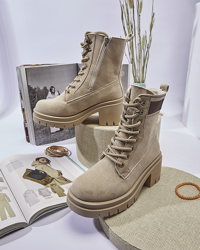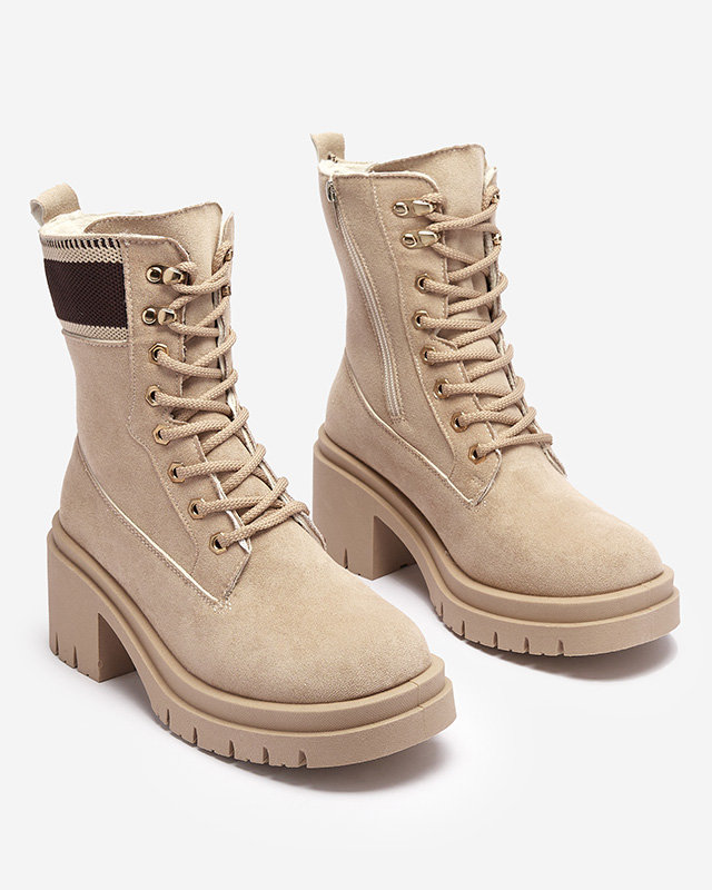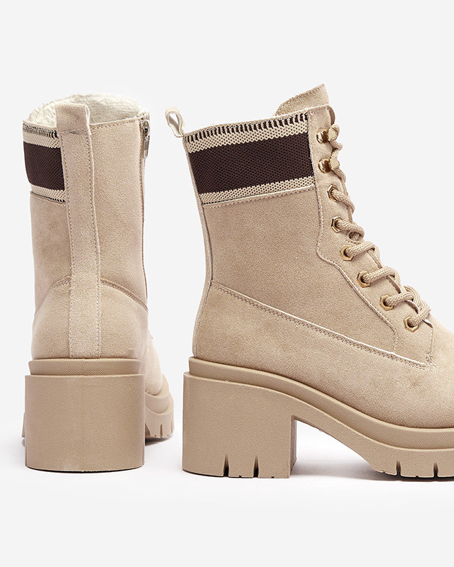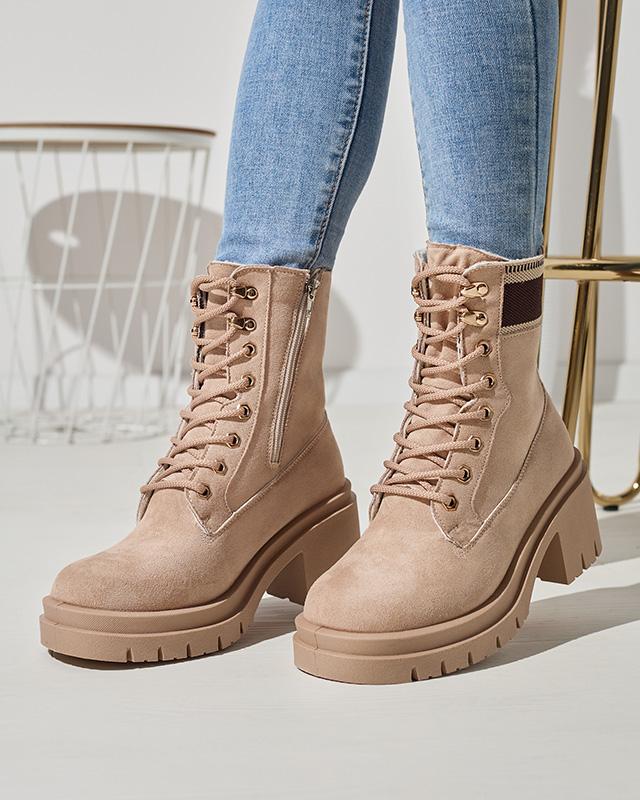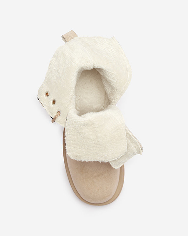 - Jemne zateplené topánky na kolíku traperského typu, vyrobené zo semišovej ekologickej kože. Vnútro je vystlané mäkkou kožušinou. Model na zips, dodatočne vybavený šnúrkami. SVETLOHNEDÉ ZATEPLENÉ ČIŽMY TRAPPER KOIDOO