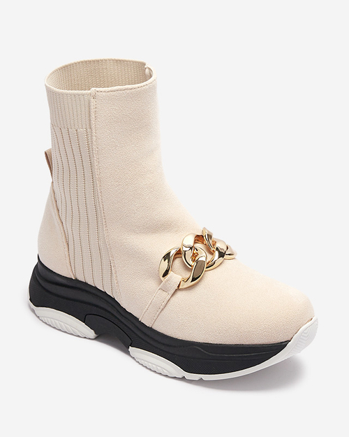 - Dámske čižmy na gumovej podrážke, vyrobené z mäkkého eko-semišu. V strede sú zateplené mäkkou kožušinou. Pár má na bokoch elastické vsadky. Zvršok je zdobený zlatou retiazkou. BÉŽOVÉ ZATEPLENÉ DÁMSKE ČIŽMY CUZITTA