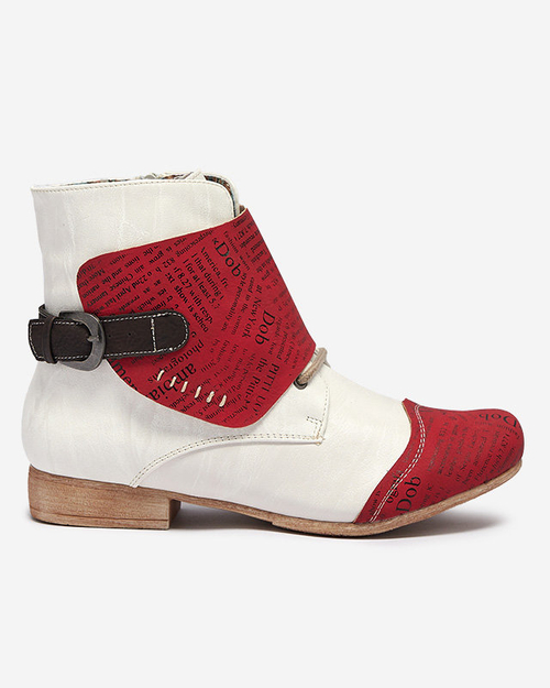 - Dámske čižmy na plochom podpätku z ekologickej kože. Model má zvršok zdobený potlačou a zapínanie na zips. BIELO-ČERVENÉ DÁMSKE BOTY GEHAMI Poznámka: výrobok má škrabance na materiáli.