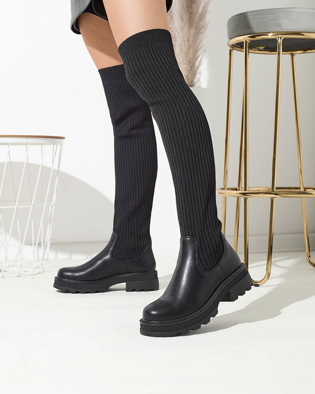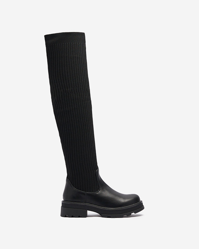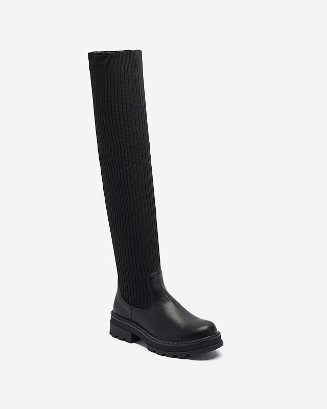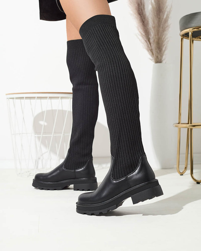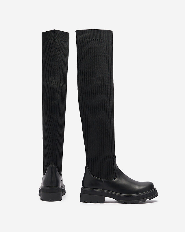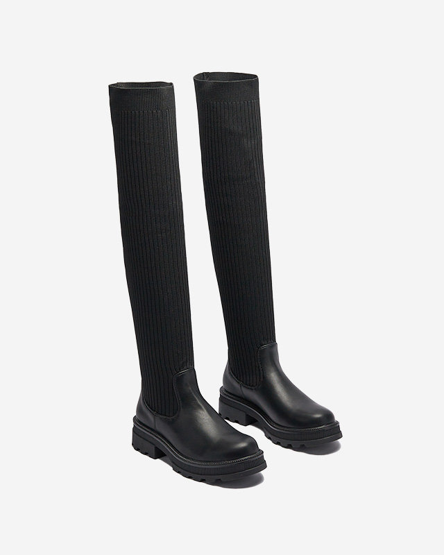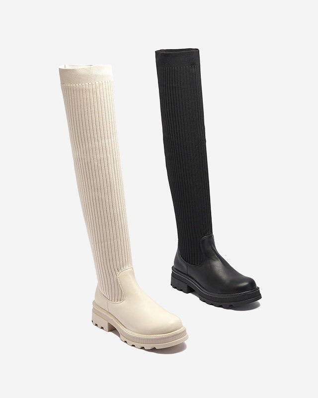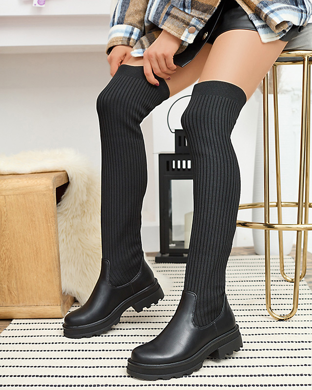 - Módne dámske vysoké čižmy nad kolená. Model je vyrobený z kombinácie ekokože a elastického textilného materiálu, s textilnou stielkou vo vnútri. Poznámka: výrobok má na materiáli škrabance.