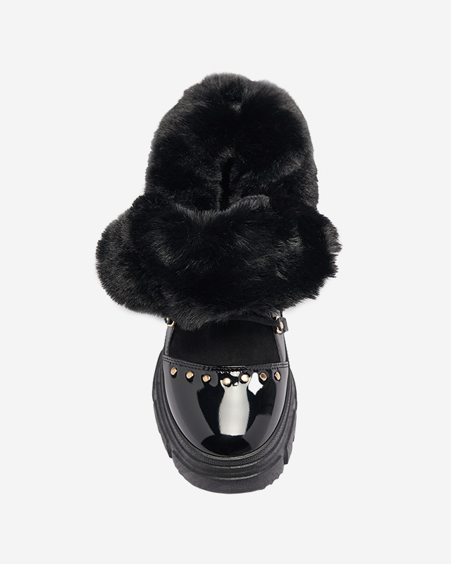 - Teplé dámske snehule na hrubšej podrážke, vyrobené z kombinácie semišu a lakovanej kože. Šnurovací zvršok, stred topánky a zvršok sú zateplené kožušinou. Na priehlavku ozdobné kamienky. ČIERNE ZIMNÉ TOPÁNKY DÁMSKE SNEHOVÉ TOPÁNKY FENTES
