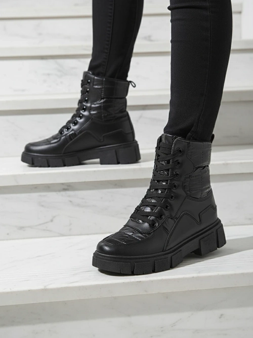 - Odlični ženski gležnarji s vezalkami a'la workerji. Zgornji del je izdelan iz kombinacije ekološkega usnja in umetnega materiala a'la cerada s prešitim zaključkom. Notranjost je obložena s tkanino. ČRNI NEPODLOŽENI GLEŽNARJI TRAPER QERTERA