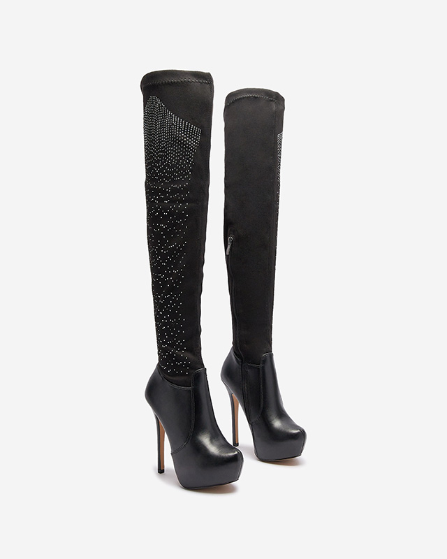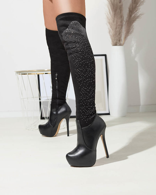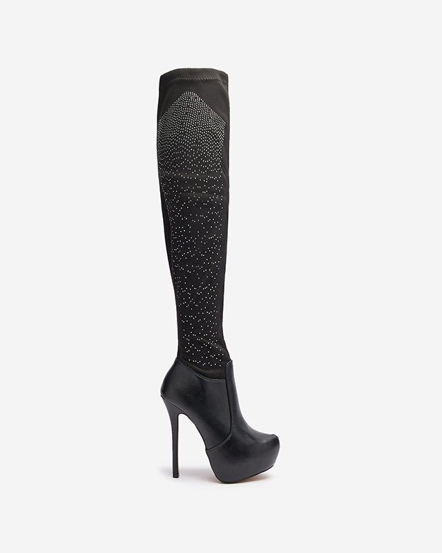 - Elegantné čižmy na podpätku a platforme z ekokože a ekosemišu. Stielka je z kožušiny. Model nad kolená, s okrúhlym nosom, zapínanie na zips do polovice lýtka. Zvršok je zdobený zirkónmi. ČIERNE DÁMSKE ČIŽMY ČIŽMY AGIOCIO