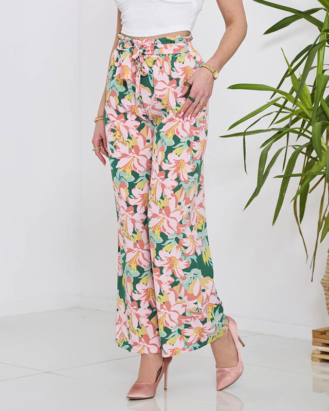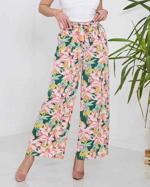 Dámske zelené palazzo nohavice s ružovými kvetmi - Oblečenie