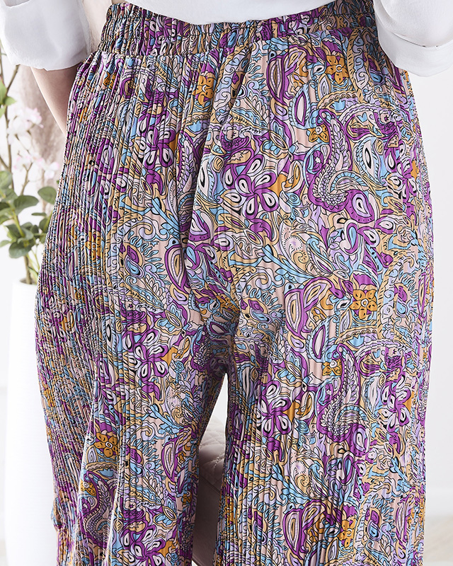 Vzorované dámske nohavice so širokými nohavicami vo fialovej farbe - Oblečenie