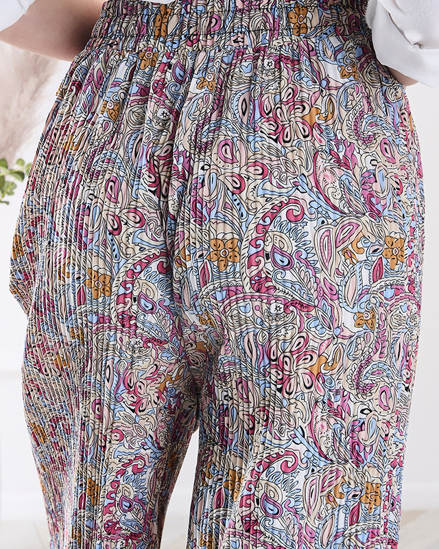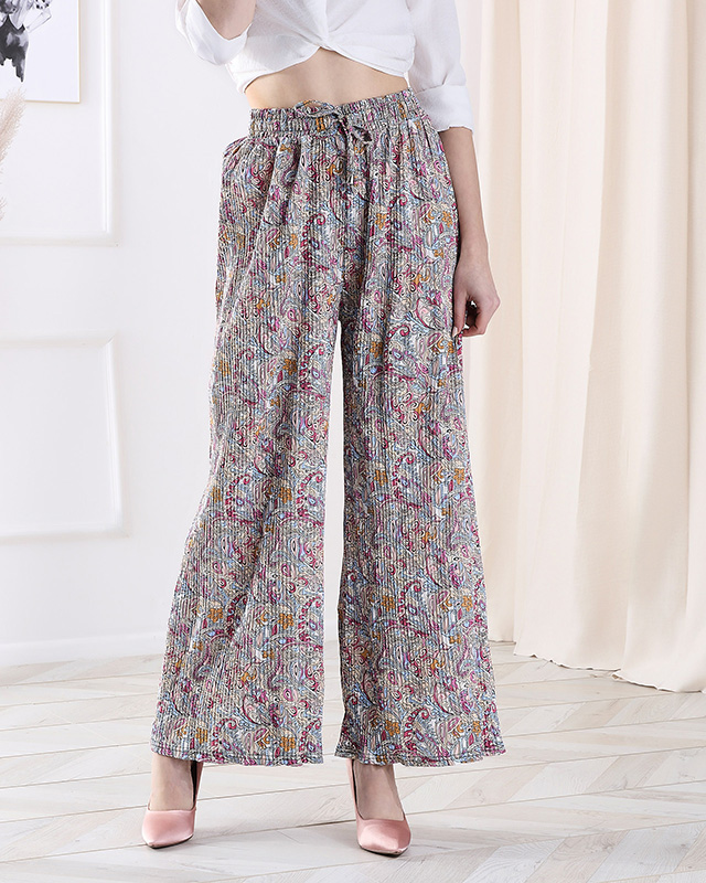 • Široké látkové nohavice so širokými nohavicami. Model je vyrobený z ľahkej a vzdušnej látky a má elastický pás a nohavice v páse. Nohavice zdobí farebná potlač. Perfektné na leto! UPOZORNENIE: Presnosť merania (+/-) 1 cm.