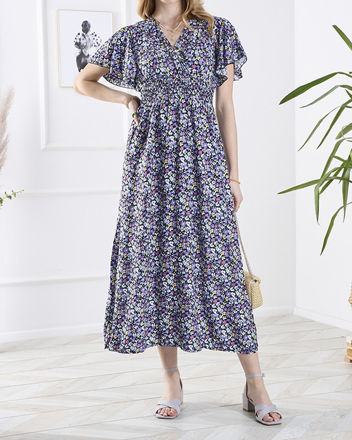 - Dámske dlhé šaty z ľahkej tkaniny s kvetinovým vzorom. Model s krátkymi rukávmi, má obálkový výstrih a široký elastický pás. Ideálny základ pre mnohé letné outfity! UPOZORNENIE: Presnosť merania (+/-) 1 cm.