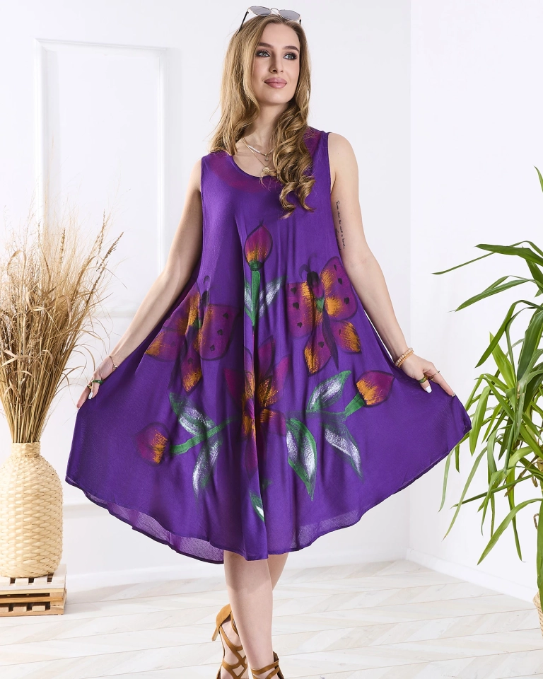 - Vzorovaná dámska sukňa a'la šaty v univerzálnej veľkosti. Výrobok je vyrobený zo vzdušnej tkaniny ukončenej potlačou. Model má okrúhly výstrih a rozšírený spodný okraj. Nepostrádateľná vo vašom dovolenkovom kufri! UPOZORNENIE: Presnosť merania (+/-) 1 cm.