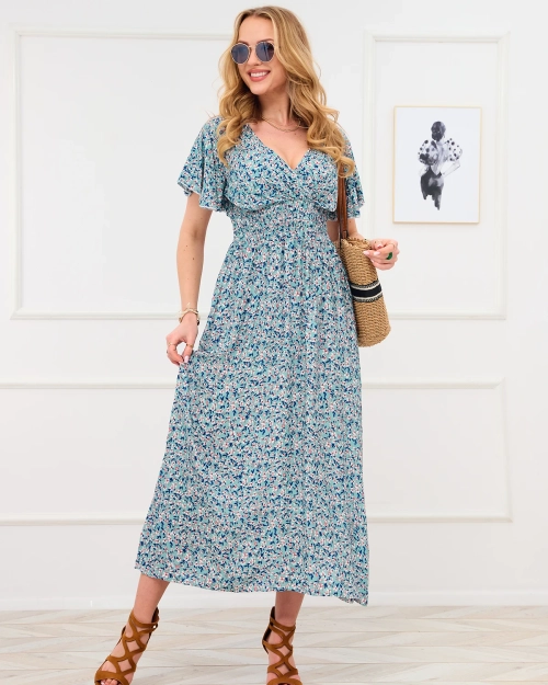 - Módne dámske šaty v midi dĺžke z bavlnenej tkaniny s kvetinovým vzorom. Model s obálkovým výstrihom má krátke rukávy a širokú gumu na zvýraznenie pásu. Ideálny základ pre mnohé letné outfity! UPOZORNENIE: Presnosť merania (+/-) 1 cm.