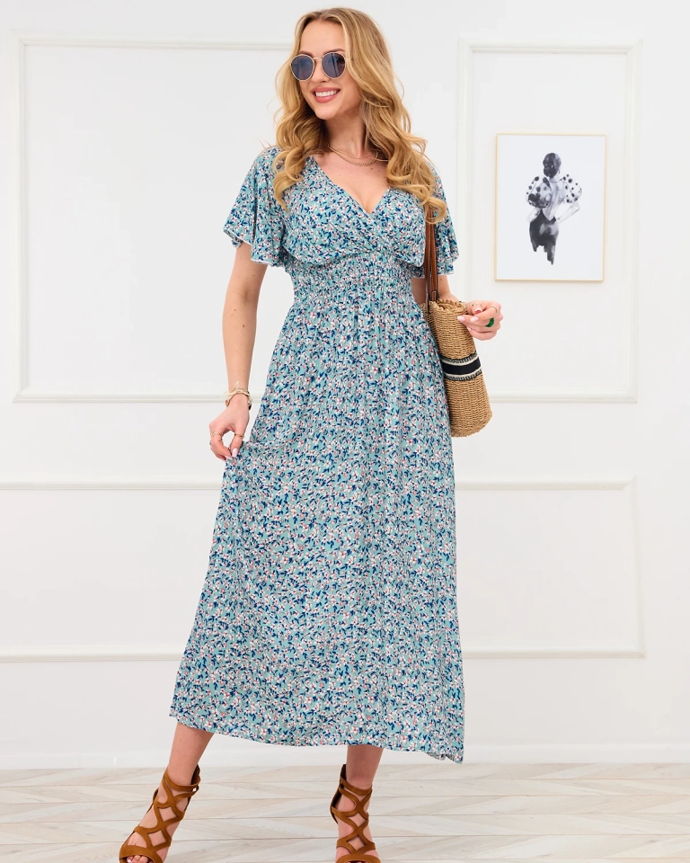 Zelené dámske kvetinové šaty s obálkovým výstrihom - Oblečenie
