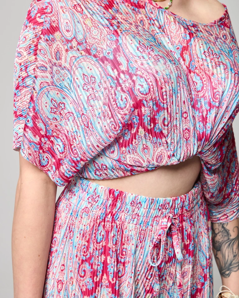 - Dámska súprava z elastickej rebrovanej tkaniny. Blúzka s krátkymi rukávmi a okrúhlym výstrihom. Dlhé palazzo nohavice s vysokým pásom, gumičkou a viazaním v páse. Celok zdobí orientálna potlač! UPOZORNENIE: Presnosť merania (+/-) 1 cm.