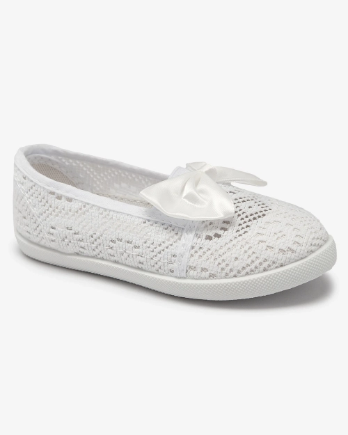 - Detské tenisky z látky s čipkovaným lemom. Zvršok zdobí saténová mašlička. Skvelá detská obuv k pestrofarebným šatám!