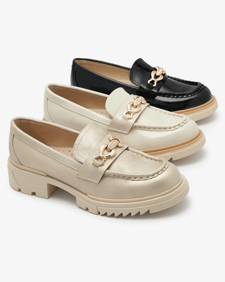 - Nádherné dámske mokasíny na pevnej podrážke. Model v ležérnom štýle a je vyrobený z ekologickej lakovanej kože, stielka je z prírodnej kože. Na priehlavku je kovová ozdoba v zlatej farbe. Budú skvelou ozdobou na každodenné štylizovanie.