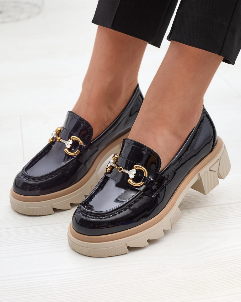 Lakované čierne dámske mokasíny s kryštálmi Inriw - Obuv