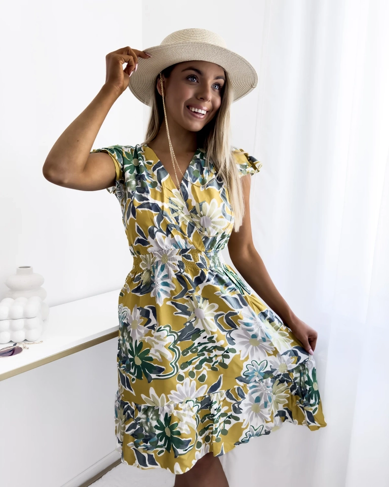 Horčicové dámske mini šaty s kvetinovou potlačou - Oblečenie