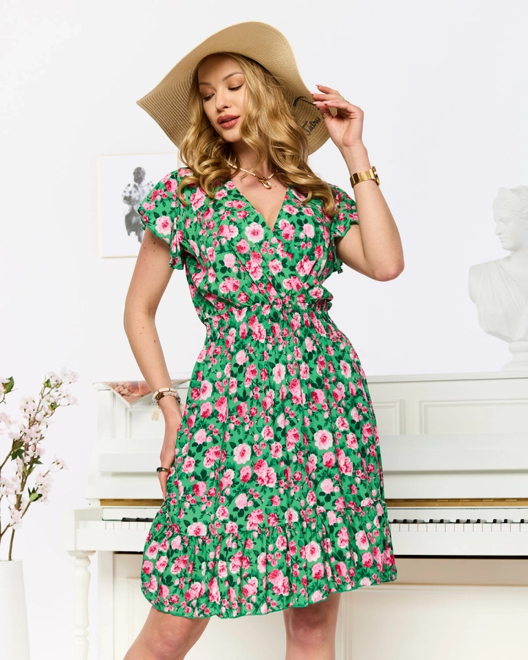 - Dámske krátke šaty z ľahkej tkaniny s kvetinovou potlačou. Model s obálkovým výstrihom a krátkymi rukávmi. Majú elastický pás na zvýraznenie pásu. Perfektné so sandálmi! UPOZORNENIE: Presnosť merania (+/-) 1 cm.