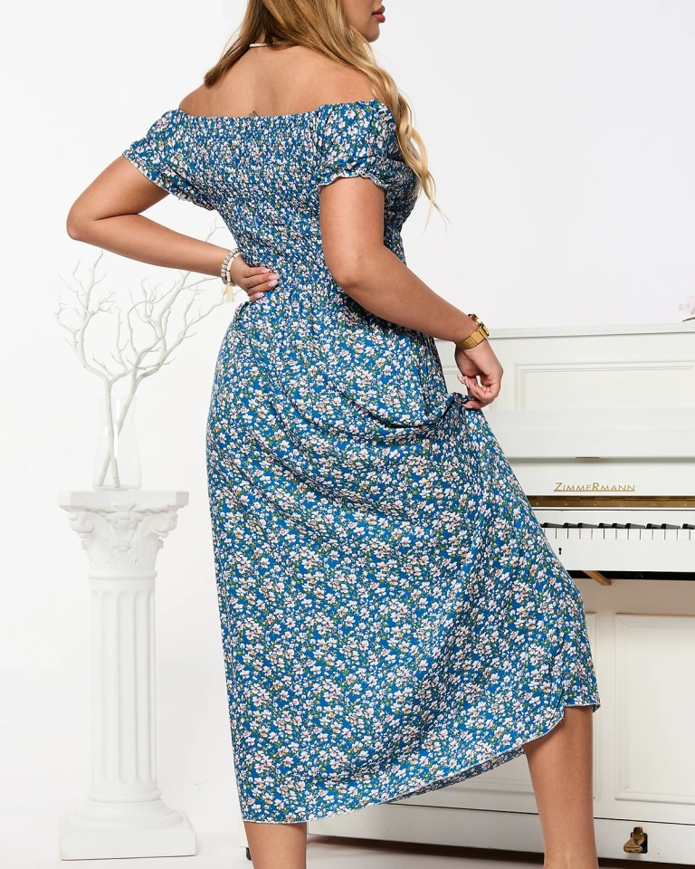 - Kvetované dámske šaty v midi dĺžke z bavlnenej tkaniny. Model zdobí potlač. Majú krátke rukávy, elastickú gumu na ramenách a na prsiach a v páse. Ideálna voľba na každodenné nosenie!