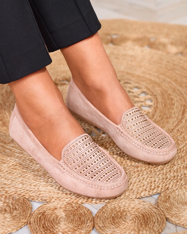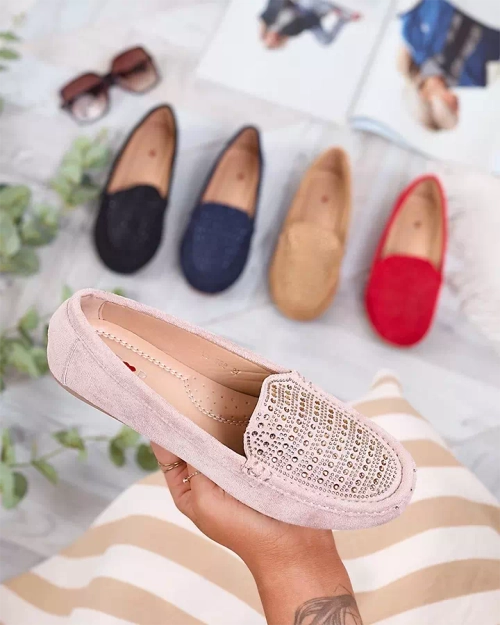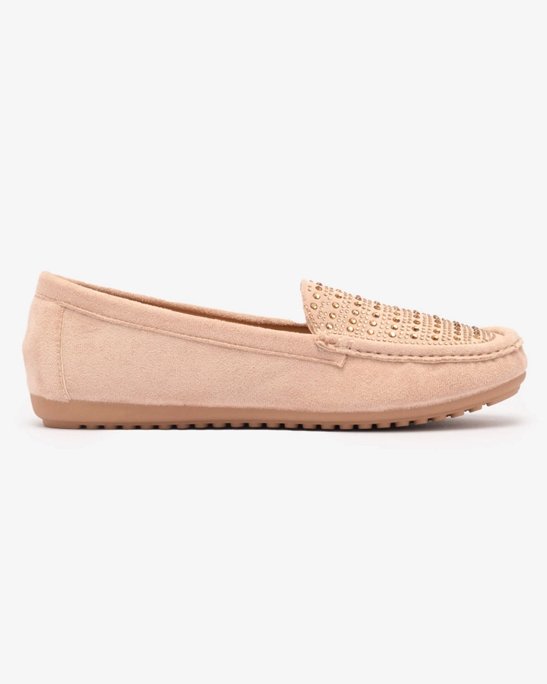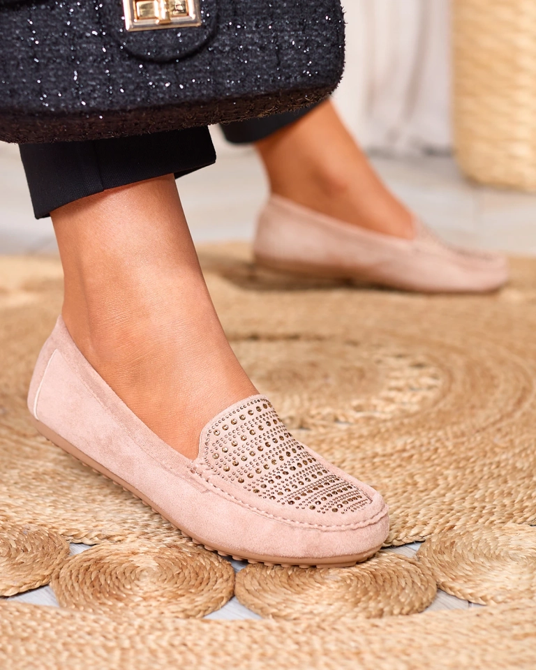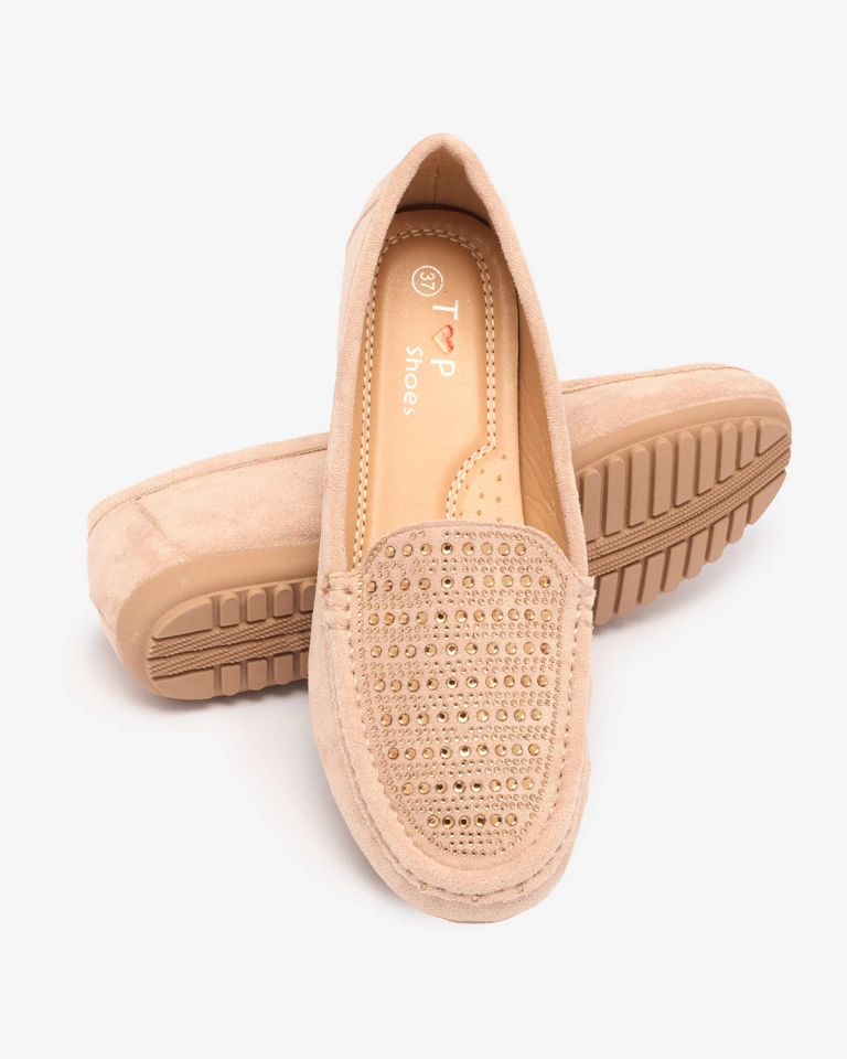 • Módne dámske mokasíny zdobené malými zirkónmi v zodpovedajúcej farbe. Zvršok je vyrobený z ekologickej semišovej kože, s mäkkou polstrovanou stielkou vo vnútri. Super doplnok k vašim ležérnym outfitom!