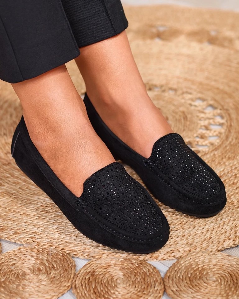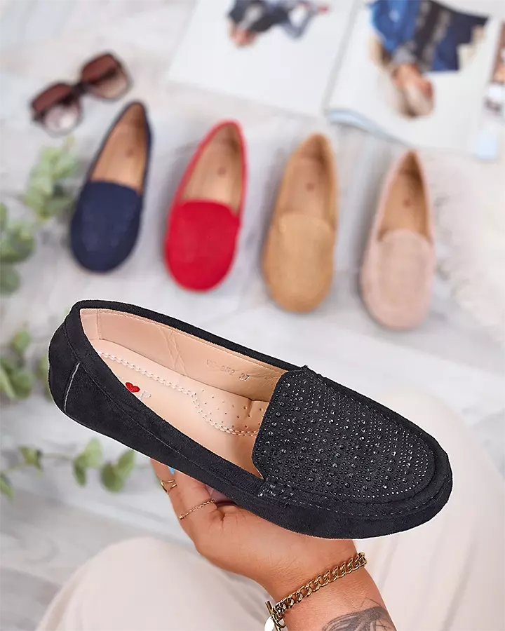 - Módne dámske mokasíny zdobené malými zirkónmi v zodpovedajúcej farbe. Zvršok je vyrobený z ekologickej semišovej kože, s mäkkou polstrovanou stielkou vo vnútri. Super doplnok k vašim ležérnym outfitom!