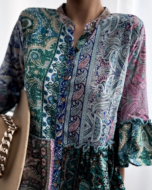 • Viacfarebné vzorované dámske krátke šaty, ktoré sú vyrobené z klzkého materiálu a'la hodváb. Šaty sa zapínajú na gombíky, majú 3/4 rukávy a spodná časť šiat je zakončená volánmi. Perfektné na leto! UPOZORNENIE: Presnosť merania (+/-) 1 cm.