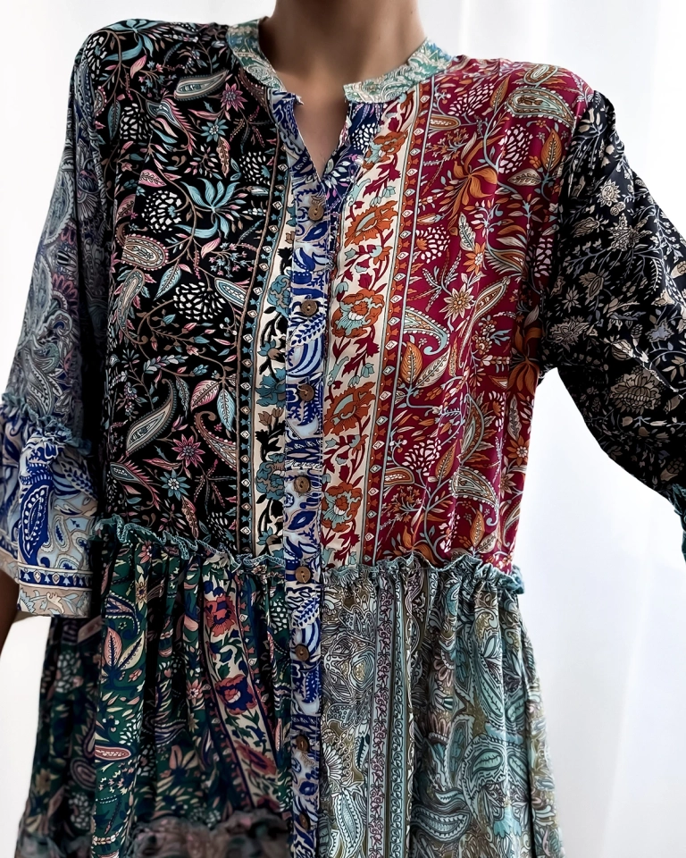 - Viacfarebné vzorované dámske krátke šaty, ktoré sú vyrobené z klzkého materiálu a'la hodváb. Šaty sa zapínajú na gombíky, majú 3/4 rukávy a spodná časť šiat je zakončená volánmi. Perfektné na leto! UPOZORNENIE: Presnosť merania (+/-) 1 cm.