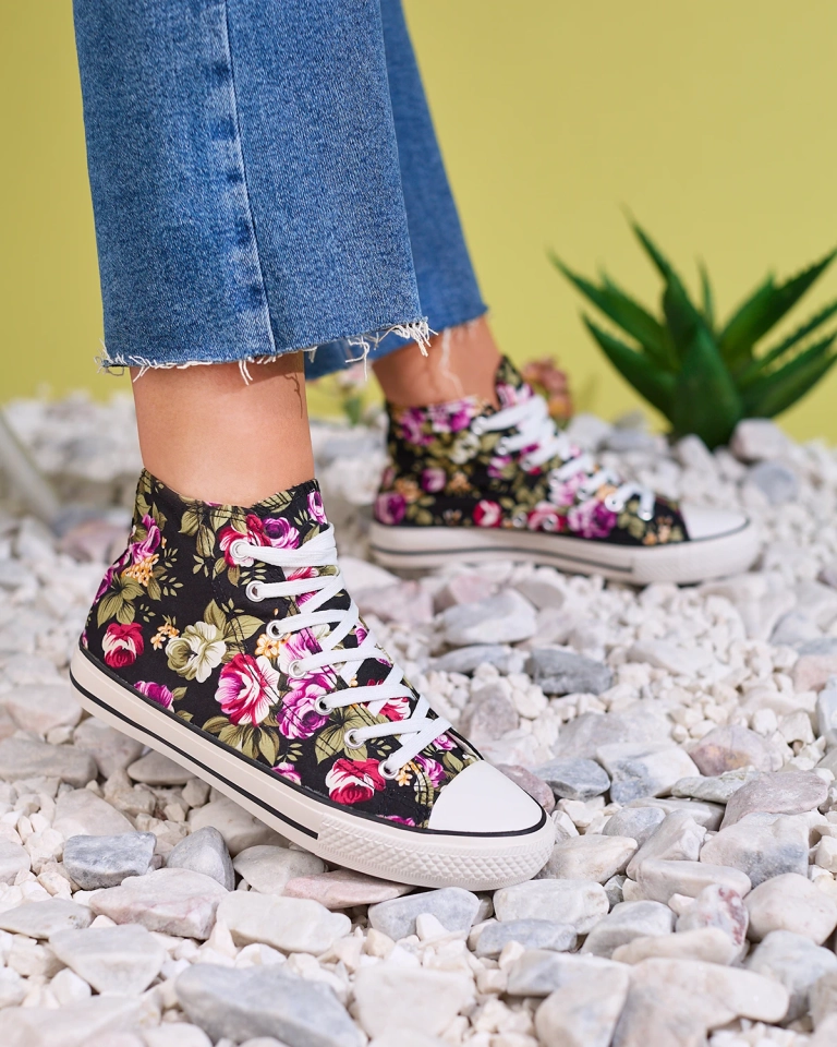 - Módne dámske vysoké tenisky z látky na gumovej podrážke. Šnurovanie a zdobenie kvetinovou potlačou, ktorá im dodáva šarm. Pohodlné a štýlové, ideálne na ležérny štýl.