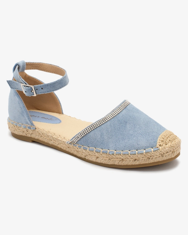 - Jedinečné dámske espadrilky z eko-semišu s textilnou stielkou. Plochá podrážka zdobená jutovou šnúrkou pre väčšie pohodlie. Zapínajú sa na pracku a zdobia ich výrazné zirkóny. Perfektné na letné stylingy, ktorým dodajú šmrnc a eleganciu.