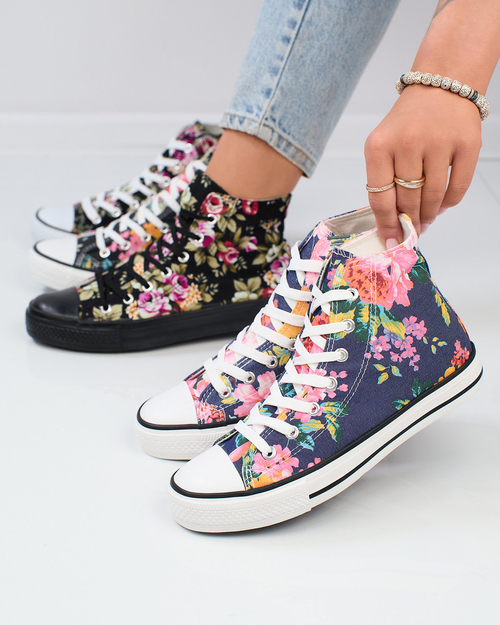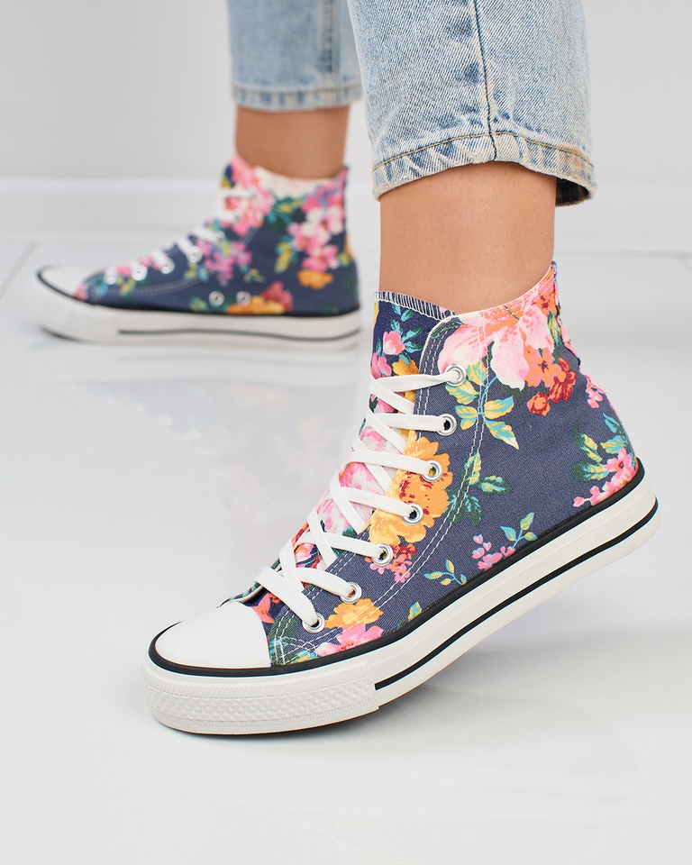 - Dámske vysoké tenisky z textilného materiálu na gumovej podrážke. Šnurovanie, poskytujú dokonalé prispôsobenie. Zdobí ich kvetinová potlač, dodáva im šarm a letný charakter. Perfektné na každodenný styling!
