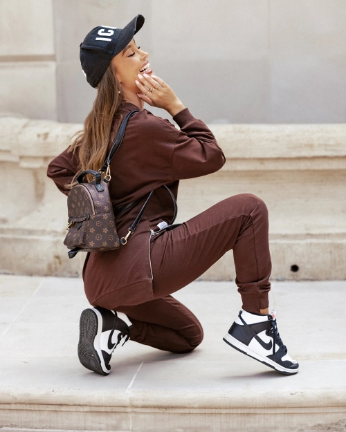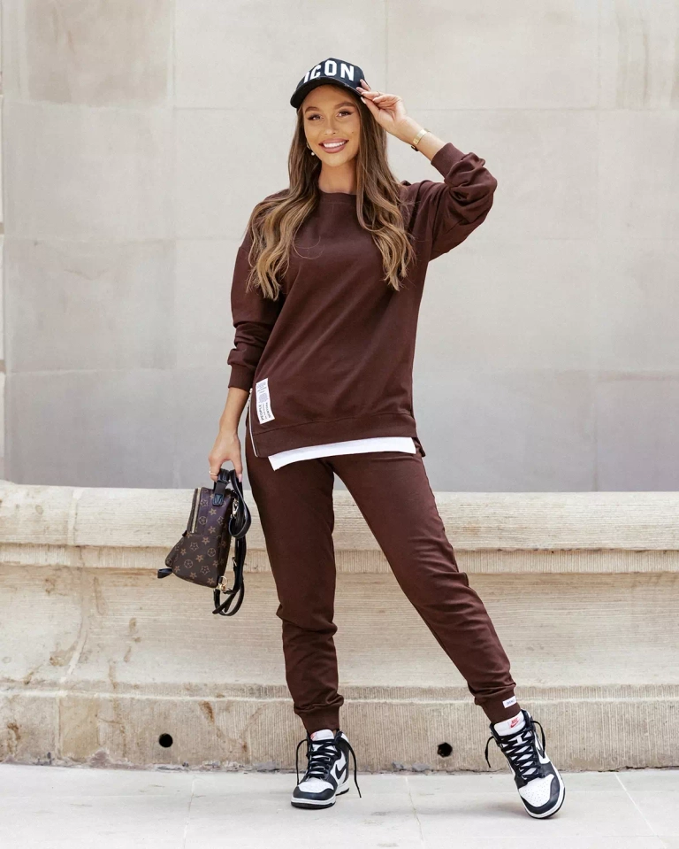 Royalfashion Tmavohnedý dámsky športový teplákový komplet so záplatami