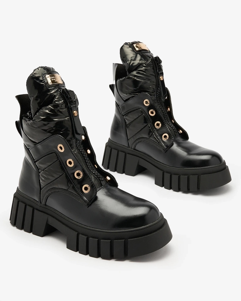 • Dámske čižmy na hrubšej podrážke. Zvršok je vyrobený z kombinácie eko lakovanej kože a materiálu a'la oilcloth. Stred je vyplnený mäkkou kožušinou. Model sa zapína na zips v prednej časti. ČIERNE DÁMSKE ČIŽMY ZATEPLENÉ ČIŽMY SELILKA