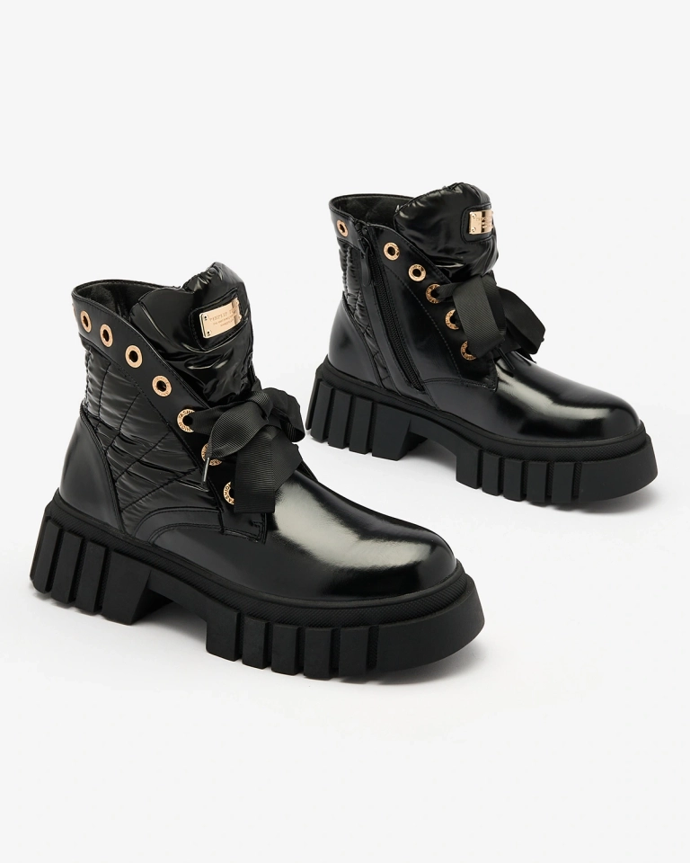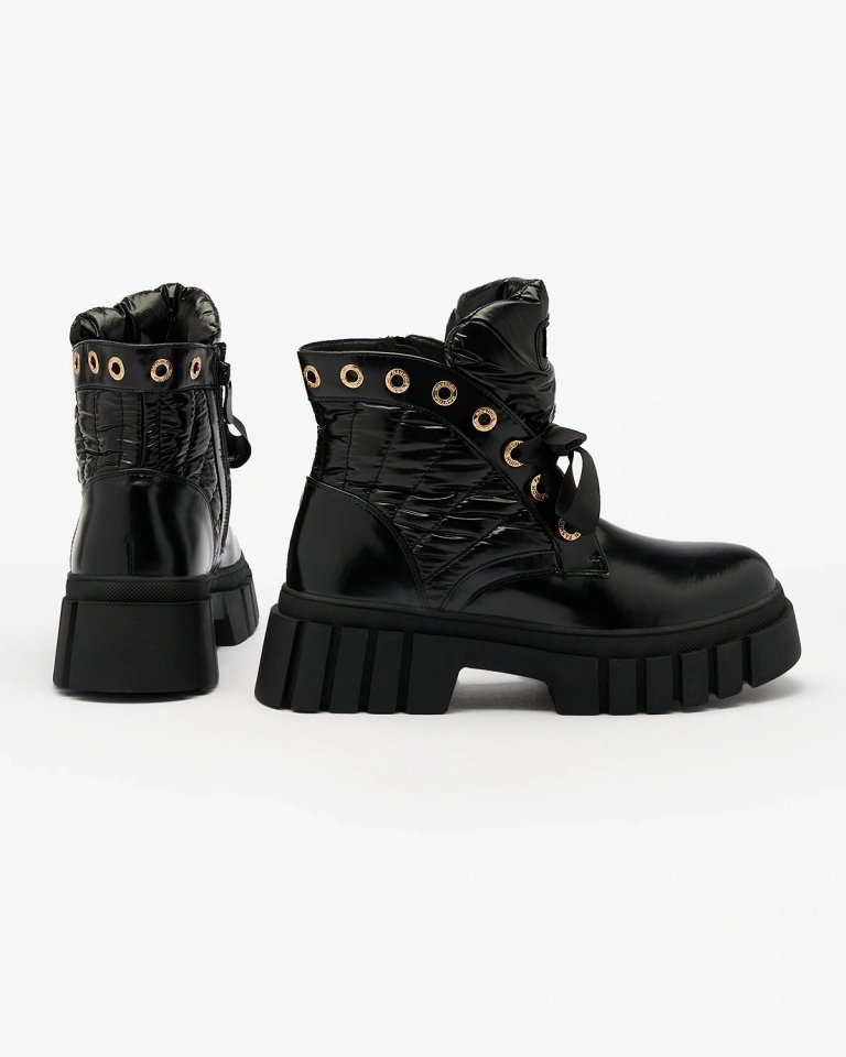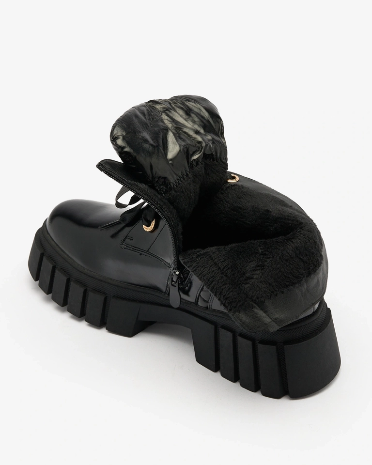 - Štýlové dámske čižmy na hrubšej podrážke, prešívaný zvršok z kombinácie ekokože a materiálu a'la oilcloth. Stred je vyplnený mäkkou kožušinou. Model so šnurovaním a zapínaním na zips. ČIERNE DÁMSKE ZATEPLENÉ ČIŽMY ALEFRO