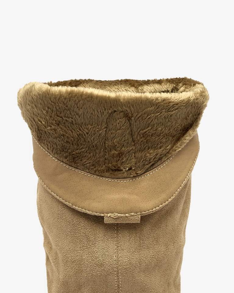 - Klasické dámske čižmy na nízkom podpätku. Zvršok je vyrobený z eko-semišu, ktorý im dodáva elegantný vzhľad. Vnútro je zateplené mäkkou kožušinou, ktorá poskytuje teplo a pohodlie počas chladnejších dní. Mandľová špička dodáva topánkam jemný a decentný ná