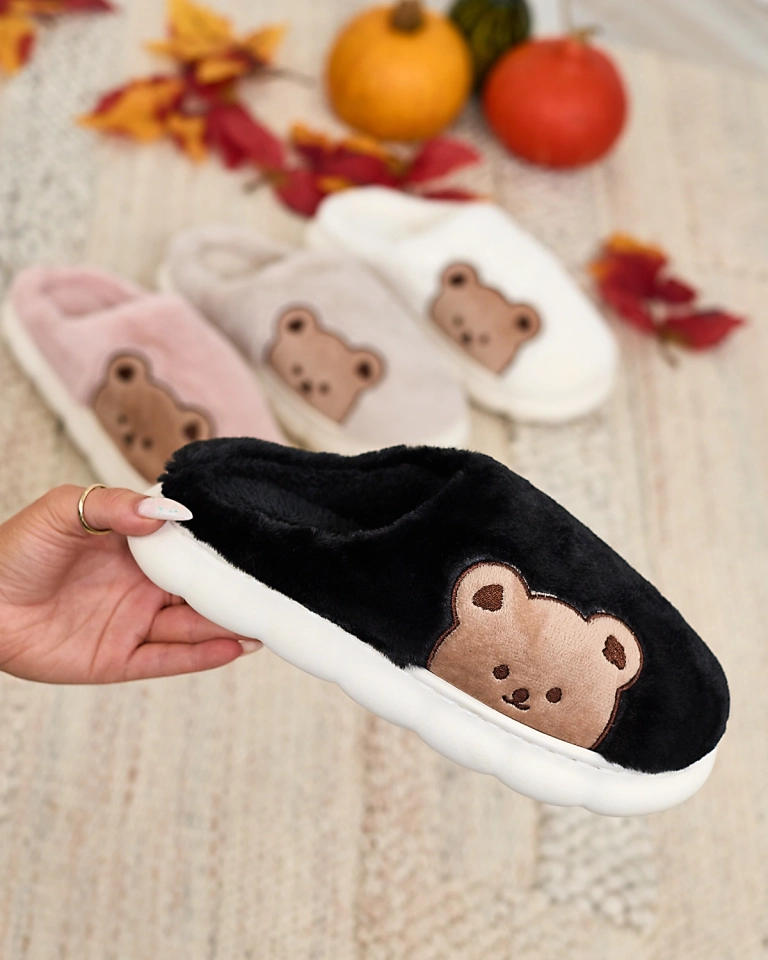 • Śliczne damskie kapcie na płaskiej podeszwie, zdobione naszywką z misiem. Model wykonany z materiału imitującego futerko. Świetna propozycją dla domowych outfitów!