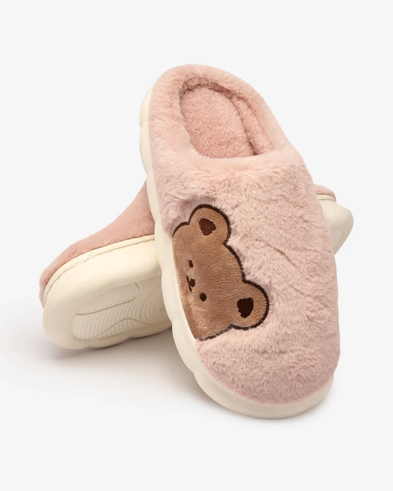 - Śliczne damskie kapcie na płaskiej podeszwie, zdobione naszywką z misiem. Model wykonany z materiału imitującego futerko. Świetna propozycją dla domowych outfitów!