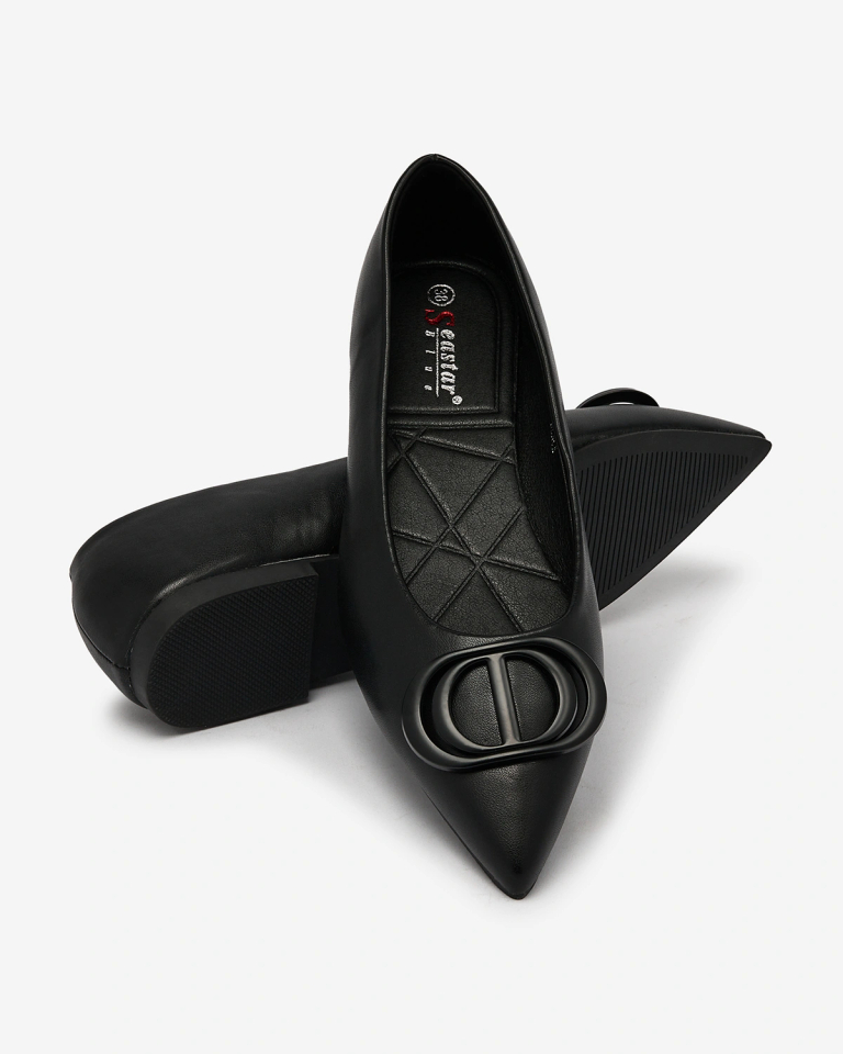 - Dámske baleríny na plochom podpätku vyrobené výhradne z ekologickej kože. Špicatý nos a zdobené kovovou sponou. Super doplnok k vašim ležérnym outfitom!