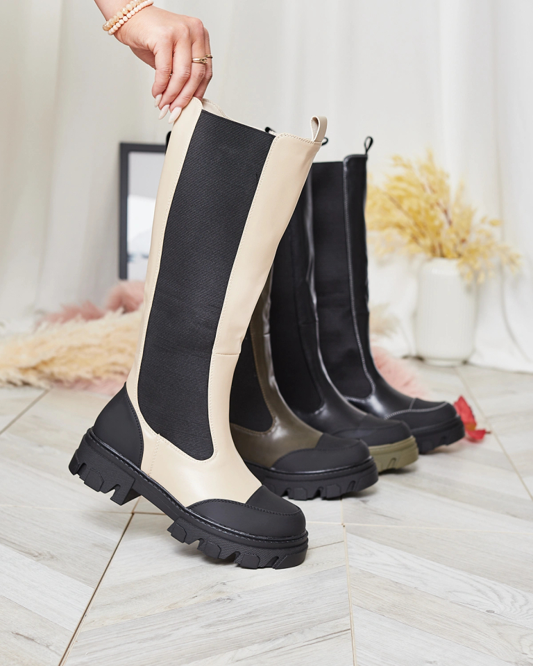 - Dámske čižmy do polovice lýtok, vyrobené z ekokože s textilnou stielkou. Model na plochom podpätku. Ozdobné vložky z matnej ekologickej kože na priehlavku a päte. Obuv na zips s elastickou vsadkou na boku.