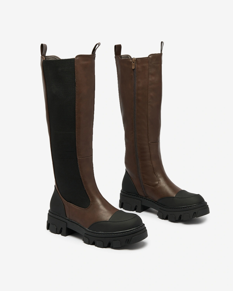 - Dámske čižmy do polovice lýtok, vyrobené z ekokože s textilnou stielkou. Model na plochom podpätku. Ozdobné vložky z matnej ekologickej kože na priehlavku a päte. Obuv na zips s elastickou vsadkou na boku.